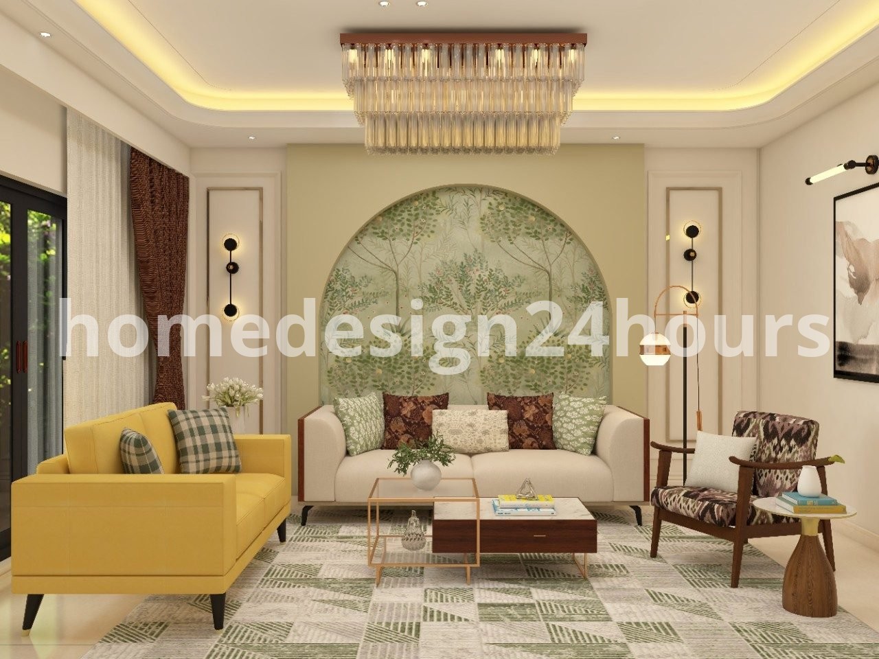 Contemporary living room with arched green panel with wallpaper and yellow and white sofas